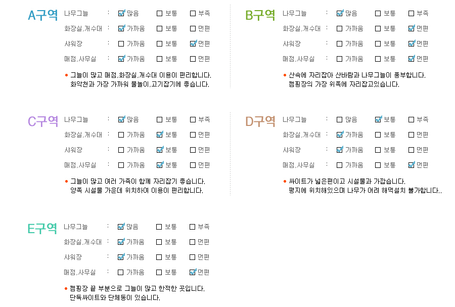 구역은 총 5개의 구역으로 나누어져 있어, 선호하는 위치에 따라 사이트를 예약하시면 됩니다.