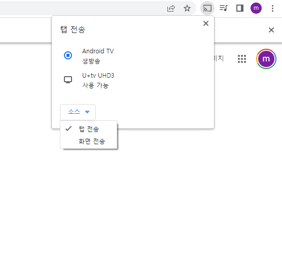 탭전송의 경우 크롬 브라우저의 현재 탭을 TV 화면으로 전송하는 것이며, 화면 전송은 노트북 화면 전체를 TV로 전송하는 것입니다.