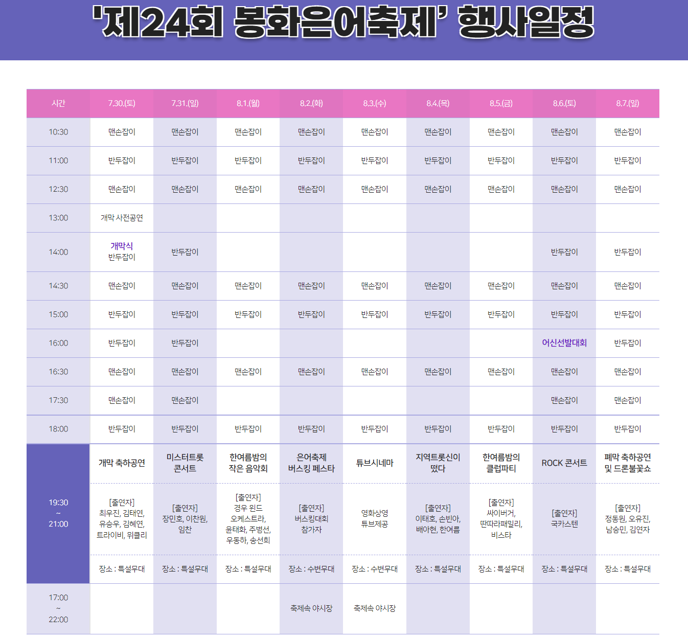 이번 제 24회 봉화 은어 축제는 7월 30일부터 8월 7일까지 총 9일 동안 봉화읍 체육공원 및 내성천 일원에서 개최됩니다.
