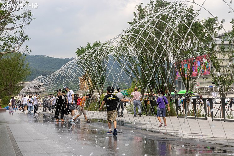 한글 분수광장이며, 바닥에 분수가 나와 이곳 또한 터널분수 못지않게 한여름에는 아이들에게 인기가 만점인 곳이다.