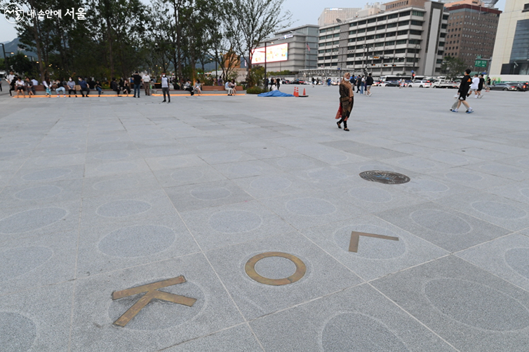 바닥에는 조선건국부터 현대까지 630년의 역사가 기록되어있는 역사 물길로 광화문을 배경으로 바닥 가까이 사진을 찍어보면 멋진 구도가 나타난다.