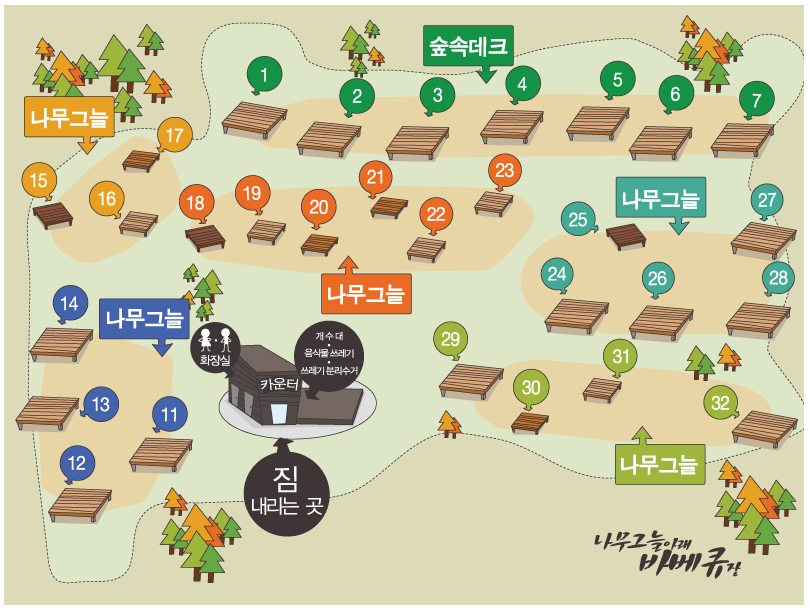 * 이용금액 : 숲속데크 (40,000원), 나무그늘(35,000원), 숯&그릴 별도 판매