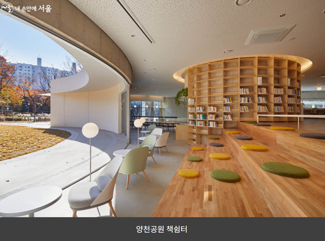 공원이 야외 공간이라고만 생각했다면, 공원 속 책쉼터에 방문해보자. 공원 내 책쉼터는 응봉 근린공원, 양천공원, 쌍문 근린공원, 구로구 천왕산 근린공원에서 만나볼 수 있으며 아차 산책 쉼터는 올해 9월에, 강서구 봉제산 책쉼터도 올해 12월, 성북구 오동 근린공원 책쉼터는 2023년 3월 개관 예정이다.