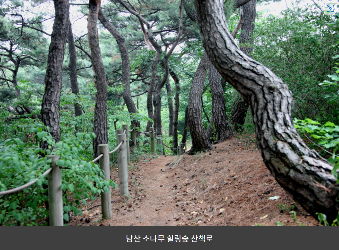 바로 남산둘레길 북측순환로에 위치한 ‘소나무힐링숲’으로 이곳은 소나무림이 지속적으로 보호 관리되고 있는 남산의 대표적인 소나무 숲길로 산책로를 따라 삼림욕과 명상을 할 수 있는 쉼터가 곳곳에 마련되어 있어 휴식하기 좋다.