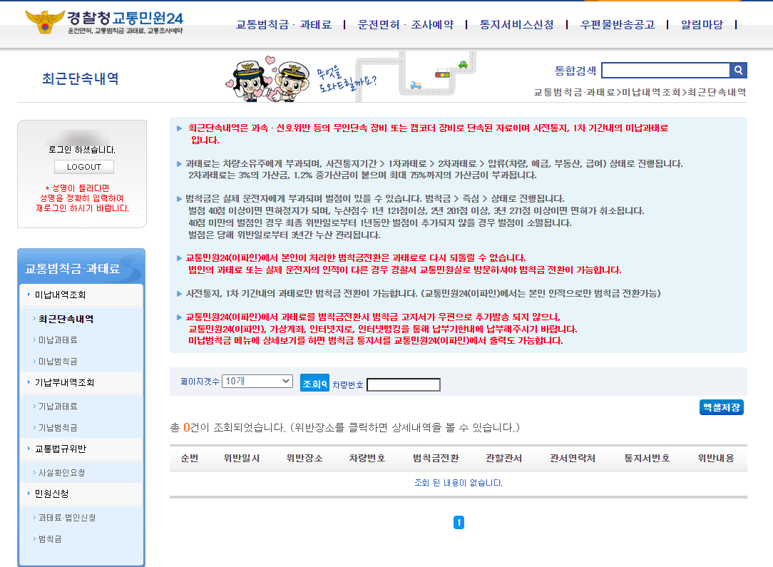 로그인 후에는 최근 단속내역, 미납과태료, 미납 범칙금 조회, 운전면허 벌점 조회, 운전경력증명서 발급 등
