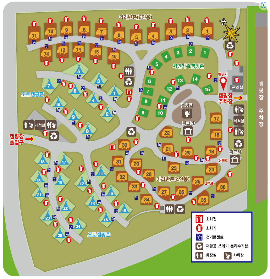 캠핑장의 사이트는 총 76면으로 카라반 36대, 오토 캠핑존 25면, 시민가족 캠핑존 15면으로 구성되어 있습니다.