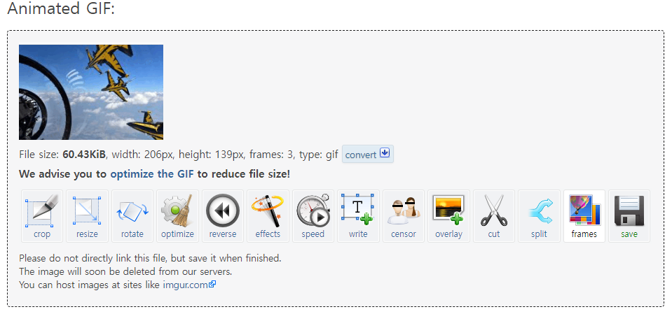 움직이는 GIF 완성본을 미리 보기 할 수 있으며, 이미지의 각 프레임에 글자를 넣거나, 효과를 주거나, 사이즈 변경 등 다양한 편집 작업을 할 수 있으며, 최종본이 완성이 되면 가장 우측의 save 버튼을 클릭하면 완성본을 다운로드할 수 있습니다.
