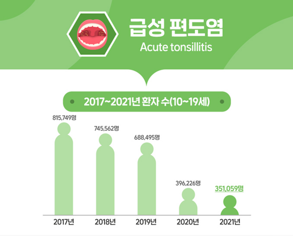 건강보험심사 평가원에 따르면 급성 편도선염은 최근 들어 10대 환자 수가 급격히 감소했으며, 성별로 봤을 때는 남성보다는