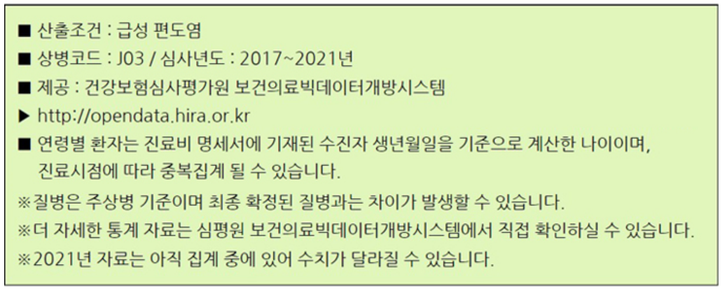 2021년 기준 연령별 환자 비율에 따르면 급성 편도염 발생 환자 중 13.8%가 10대인 것으로 집계가 되었습니다.