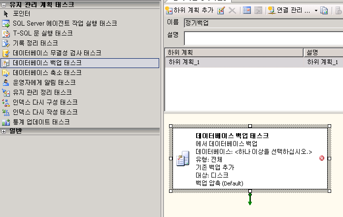 데이터베이스 백업 태스크 선택 후 마우스를 드래그하여 끌어다 놓으면,