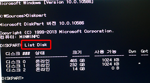3. 커서가 DISKPART로 변경이 되었으면 List Disk라고 명령어를 입력 후 엔터를 누릅니다.