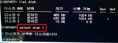 4. PC에 설치되어있는 디스크 목록이 나타나면 윈도우를 설치할 디스크를 선택합니다. 화면상에서는 디스크 1에다 설치를 하려고 하며 디스크 1에 Gpt란에 *가 있는 것을 볼 수 있습니다. 디스크를 선택하기 위해 select disk 1이라고 입력을 합니다.